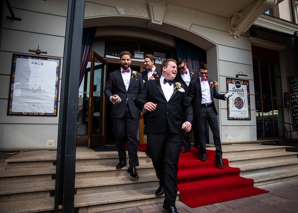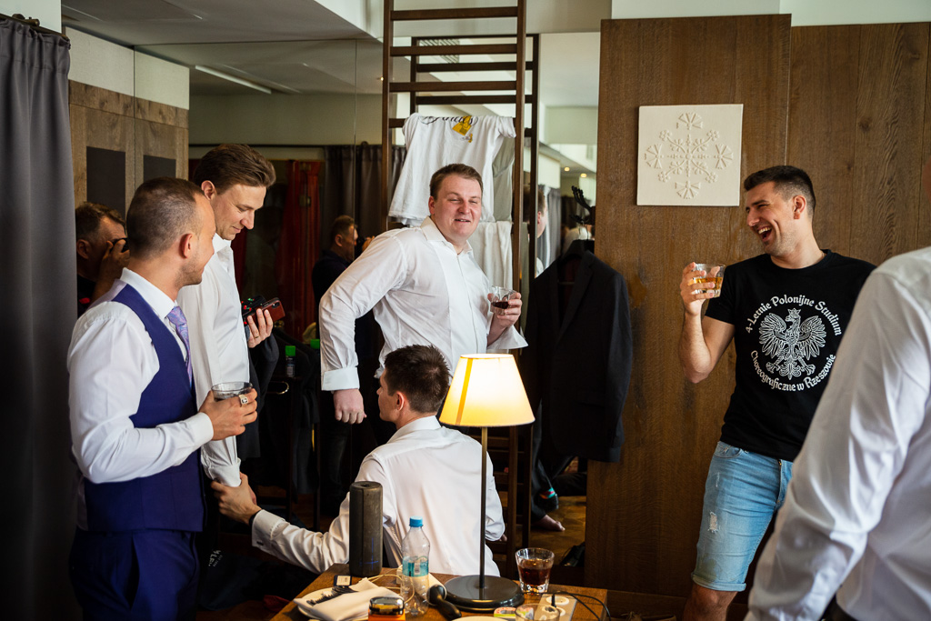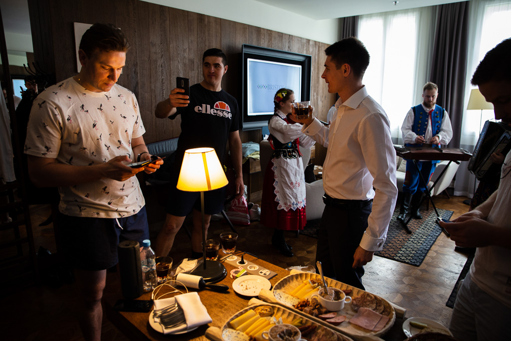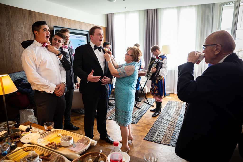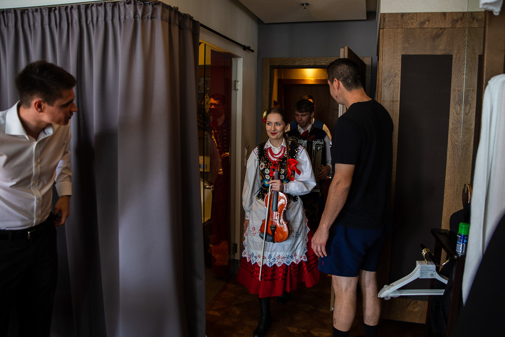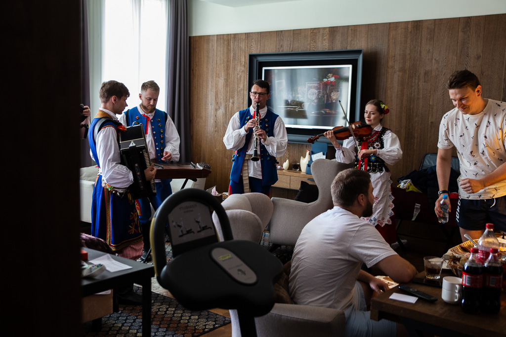 U Roberta było wręcz odwrotnie. Mały biesiadny stolik, złoty napój filtrowany przez węgiel drzewny i… kapela folklorystyczna! Im bliżej wyjścia do kościoła, tym muzyka głośniejsza a śpiewy weselsze. Robert i jego drużbowie nawet podsuwali pomysły na przyśpiewki. Ale, pomyślałem, skąd je znali…?