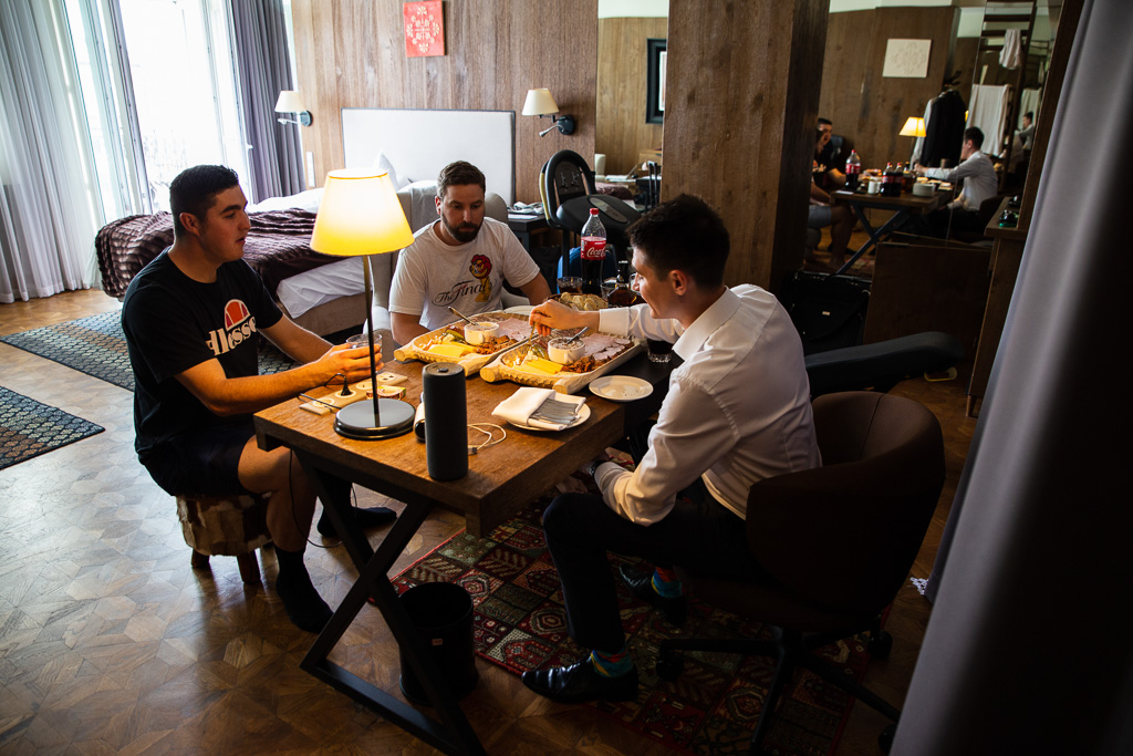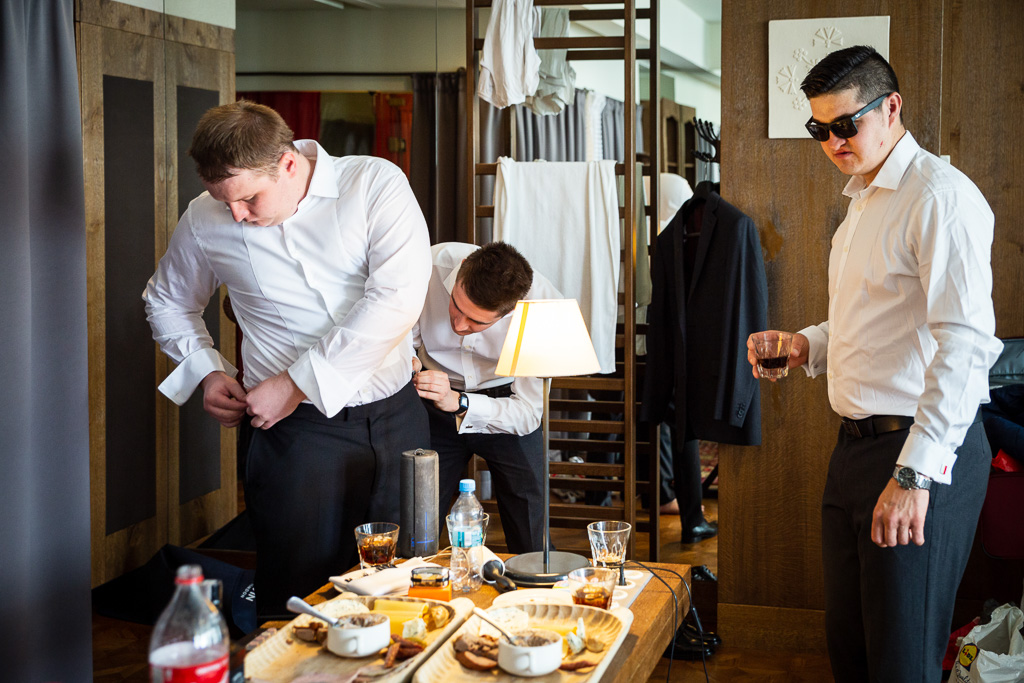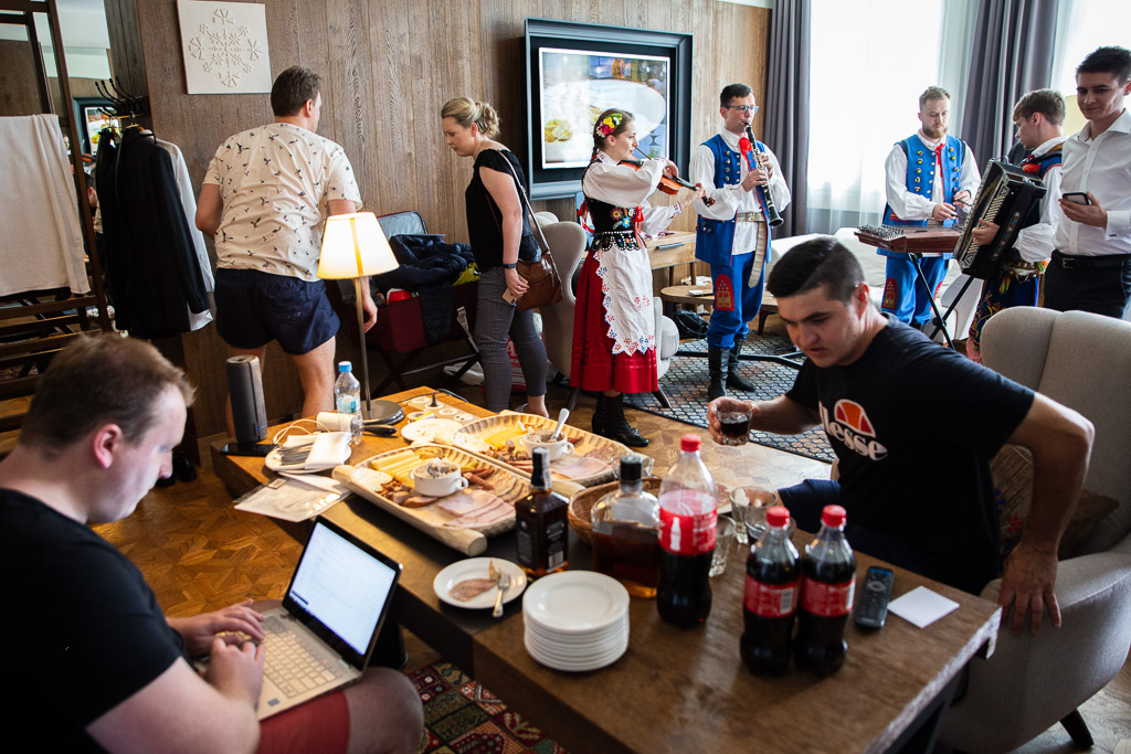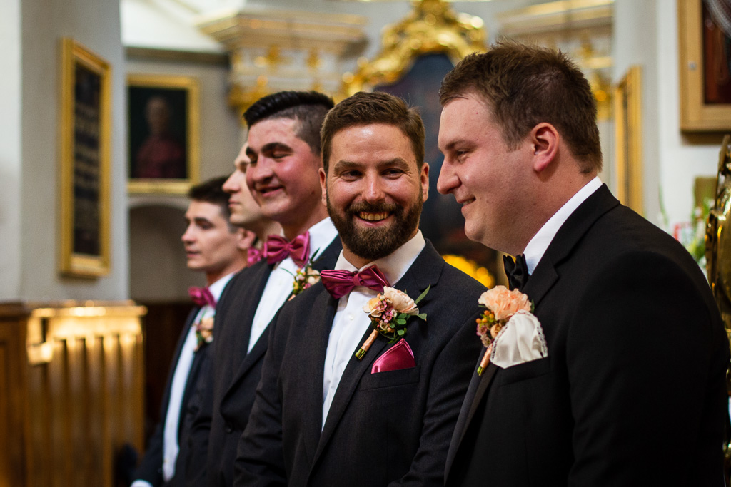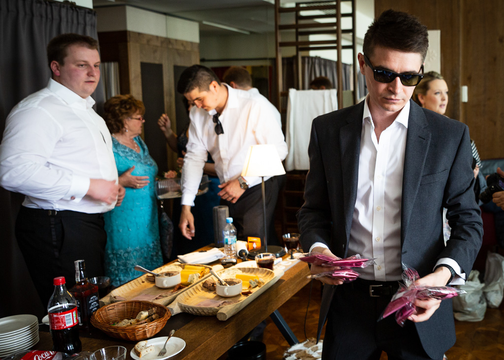 U Roberta było wręcz odwrotnie. Mały biesiadny stolik, złoty napój filtrowany przez węgiel drzewny i… kapela folklorystyczna! Im bliżej wyjścia do kościoła, tym muzyka głośniejsza a śpiewy weselsze. Robert i jego drużbowie nawet podsuwali pomysły na przyśpiewki. Ale, pomyślałem, skąd je znali…?