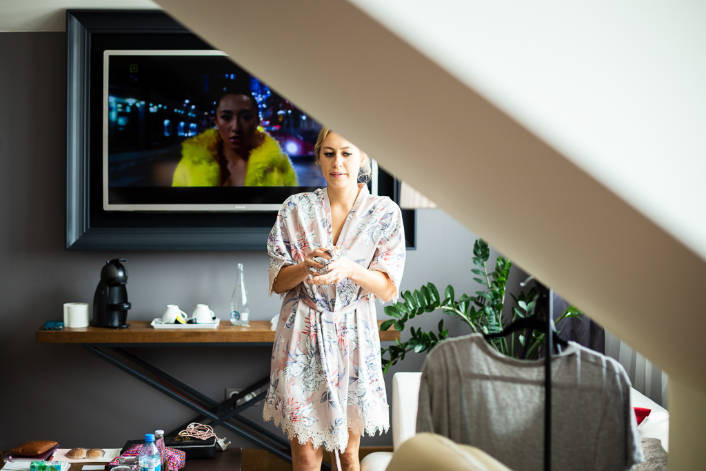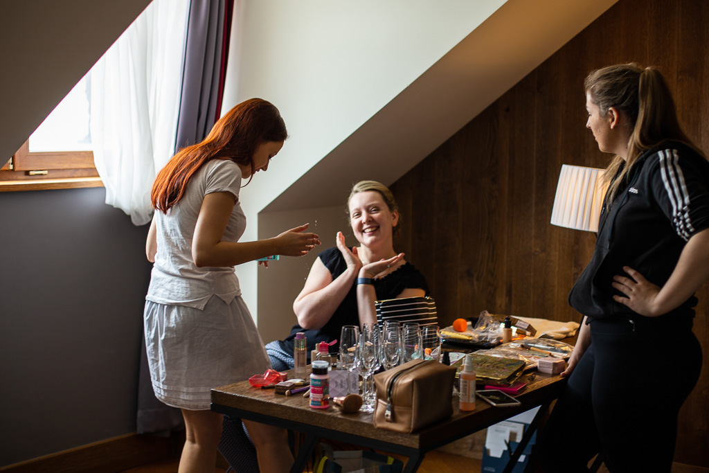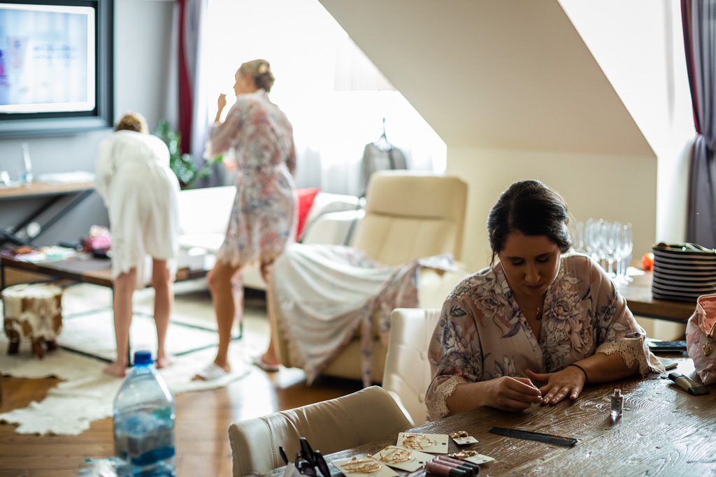 Jak to zawsze u nas bywa – przygotowania fotografujemy niezależnie, oddzielnie. Paulina spędziła miło czas w towarzystwie Apolonii i jej przyjaciółek -drużek. Piękne światło wpadające przez okna, z rzeszowskiego Rynku podkreśliły klasę i elegancję dziewczyn. Czas płynął jakby wolniej, było miejsce na rozmowy, uśmiechy, prezent i błogosławieństwo od Rodziców Apolonii.