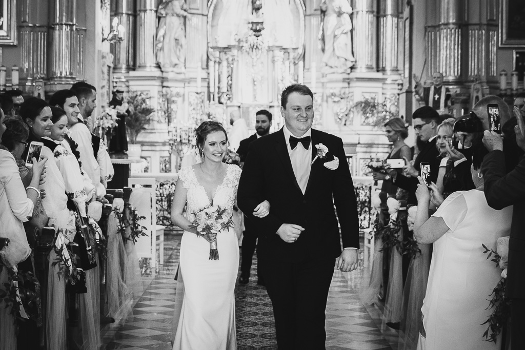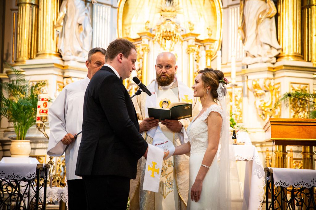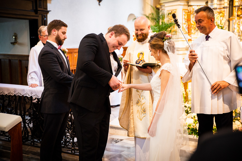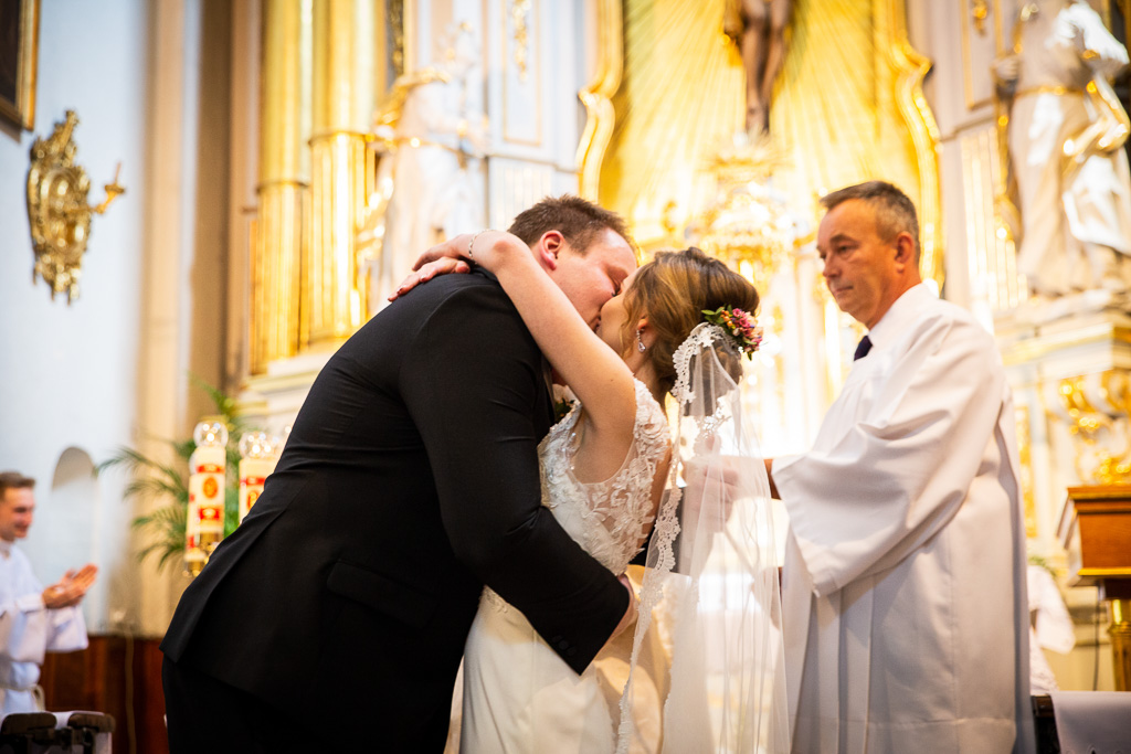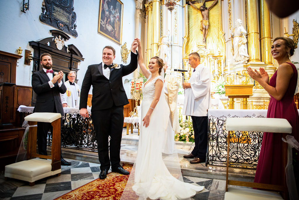 Wejście do kościoła jak malowane, kościół przytłacza swoim pięknem, momenty zamyślenia, dłonie złączone w uścisku, spojrzenie, słowa, uśmiech, pocałunek i… Gruchnęły oklaski. Widać było, że to nie tylko Apolonia i Robert cieszyli się ze swojego ślubu ale i rodzina i cały tłum przyjaciół, których przywieźli z bardzo odległych nam miejsc. Wspaniały widok!